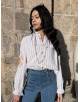 Blouse à rayures bleues avec de délicates broderies sur les manches, agrémentée de jolis détails à collerette au niveau du col et des poignets.