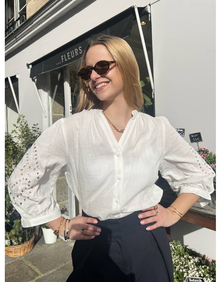 Blouse blanche en 100 % coton, idéale pour un confort optimal au quotidien. Son col en V apporte une touche féminine et élégante, tandis que ses manches 3/4 ornées de délicats détails de broderies lui donnent un charme bohème parfait pour la saison printanière.