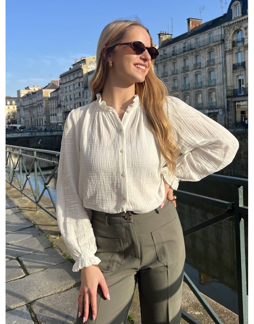 Blouse en gaze de coton blanc, une matière agréable et douce. Parfaite pour vos looks quotidiens, qui s’accorde à merveille avec nos pulls et gilets sans manches.
