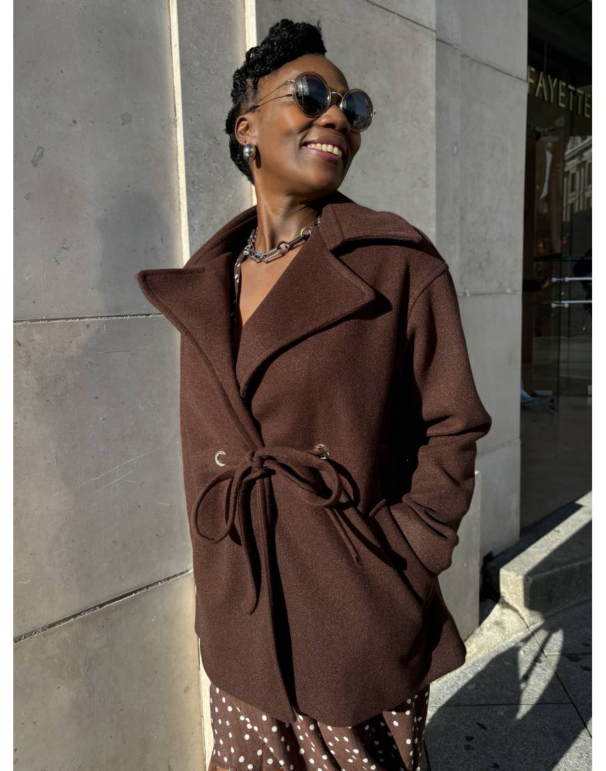 Manteau couleur chocolat avec ceinture à lacet, très élégant et raffiné, idéal pour sublimer la silhouette féminine. Son design moderne allie confort et sophistication, parfait pour toutes les occasions, du quotidien aux événements plus habillés.