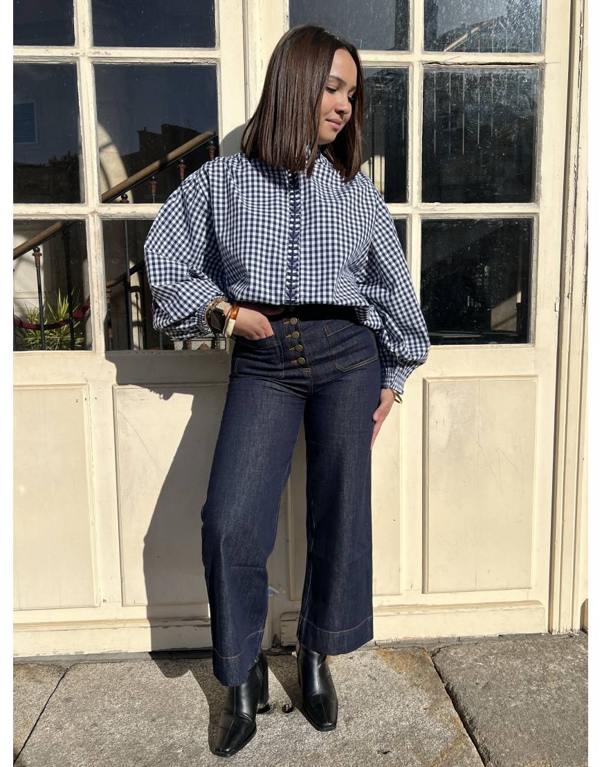 Jean bleu brut au style intemporel, doté d’une ligne de boutons et un détail de poche sur devant. Idéale pour les petite silhouettes