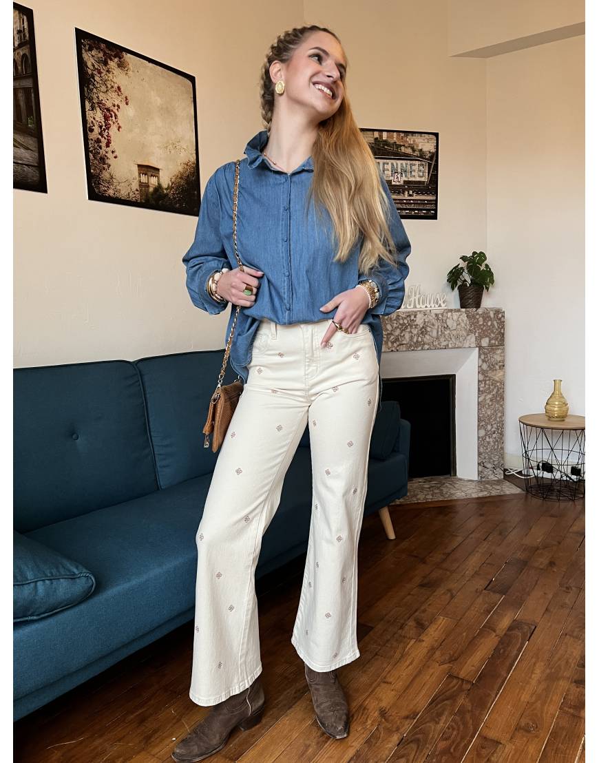 Jean Doris couleur écru avec délicates broderies pour un style bohème, parfait pour le printemps. Taille haute qui met en valeur la silhouette.