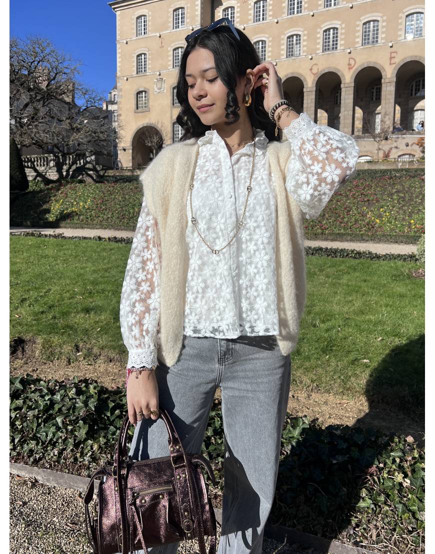 Gilet sans manches en mohair écru, une véritable douceur à enfiler sur vos chemises, blouses ou même un simple tee-shirt. Confortable et enveloppant, il vous tient délicieusement chaud.